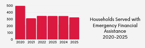 In FY2025, 327 local families received emergency funds for rent, security deposits, utilities, medical bills, and other essentials. Since 2020, the family emergency assistance program has served 2180 local families.